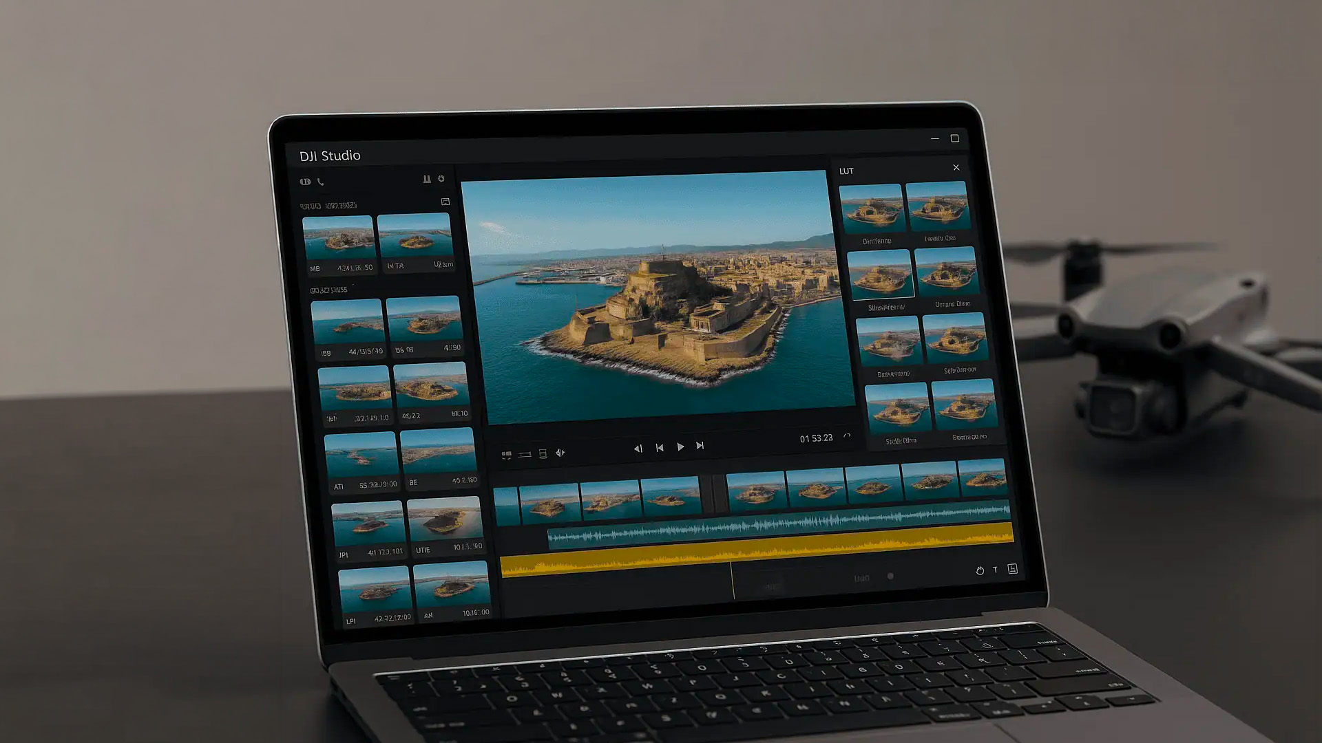 O DJI Studio é uma aplicação desktop disponível para Windows eMac, focada na pós-produção e reframe de vídeos criados por equipamentos DJI capazes de criar vídeos em 360° como Osmo 360 e Avata 360. O software permite importar, editar, ajustar cor/velocidade e exportar conteúdos imersivos, além de permitir o uso de keyframes para controlar a perspectiva.