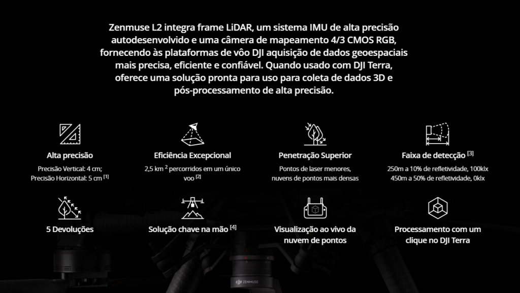 Uma coisa legal do Zenmuse L2 é que ele é muito preciso. Ele consegue saber exatamente onde está e como está esvoaçante, graças a um sistema chamado RTK. Isso o deixa bem confiável e preciso.