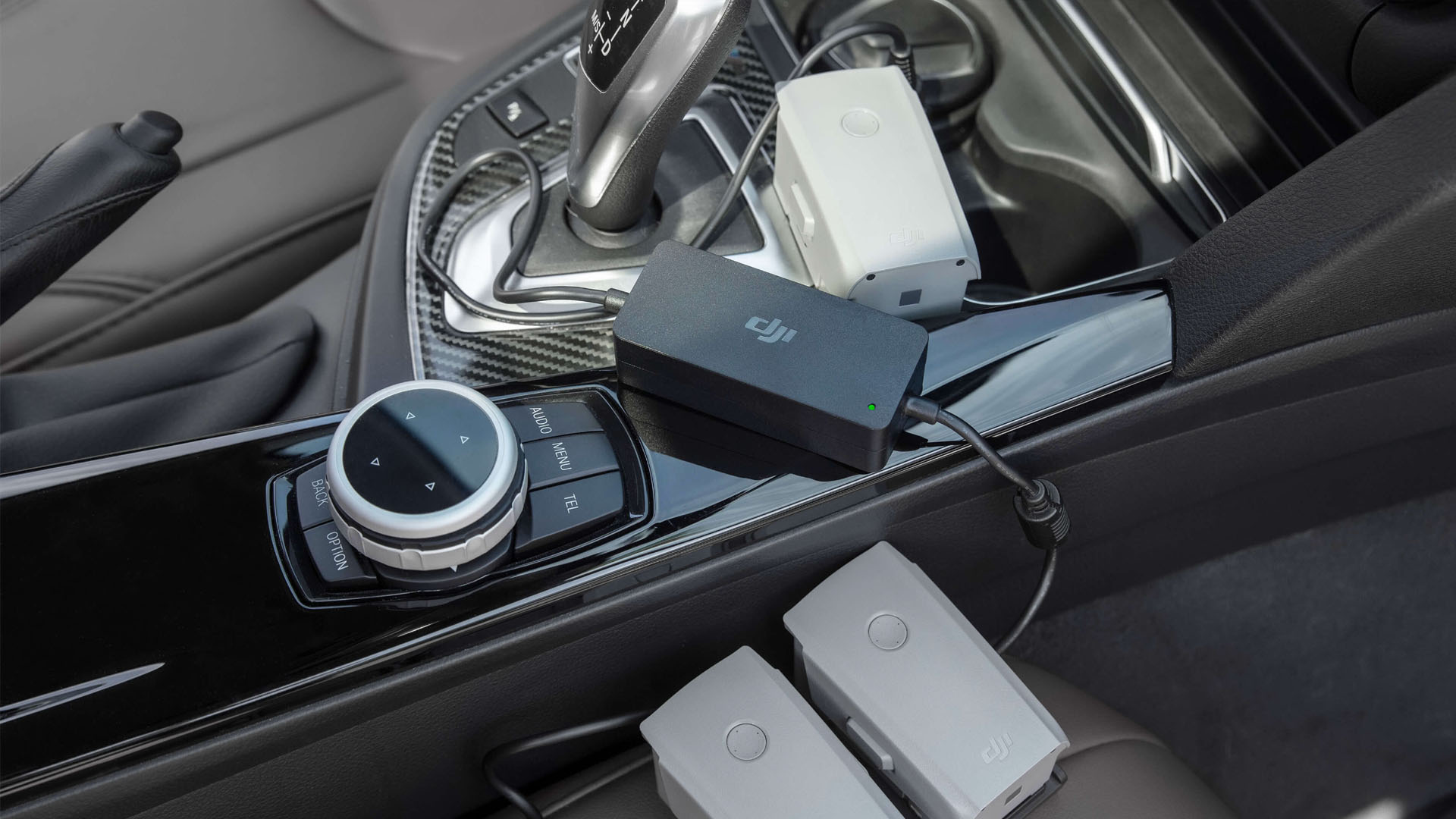 O carregador veicular do Mavic Air 2 tem uma potência máxima de saída de 35,6 W, permitindo carregar as baterias enquanto você dirige.