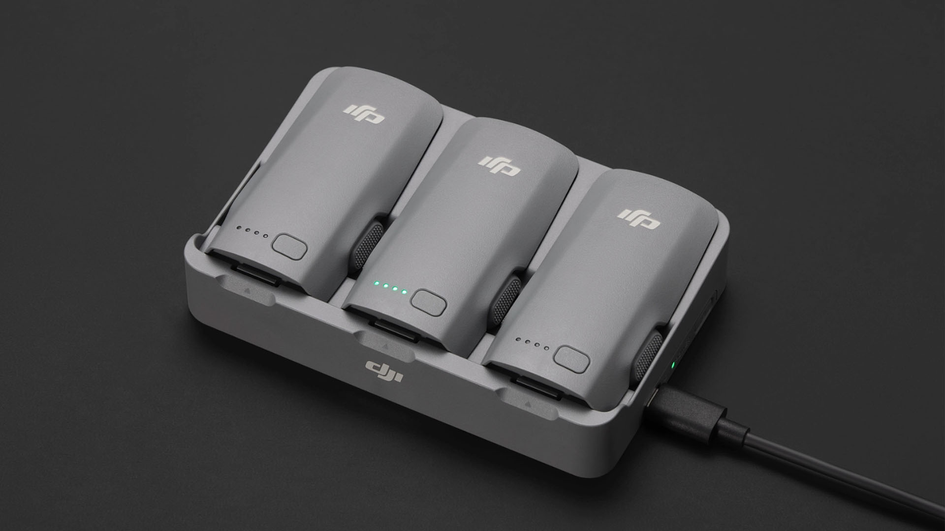 Ele pode armazenar e carregar baterias. Quando usado com o carregador portátil DJI de 65 W, pode carregar completamente três baterias de voo inteligentes simultaneamente* em apenas 68 minutos**.